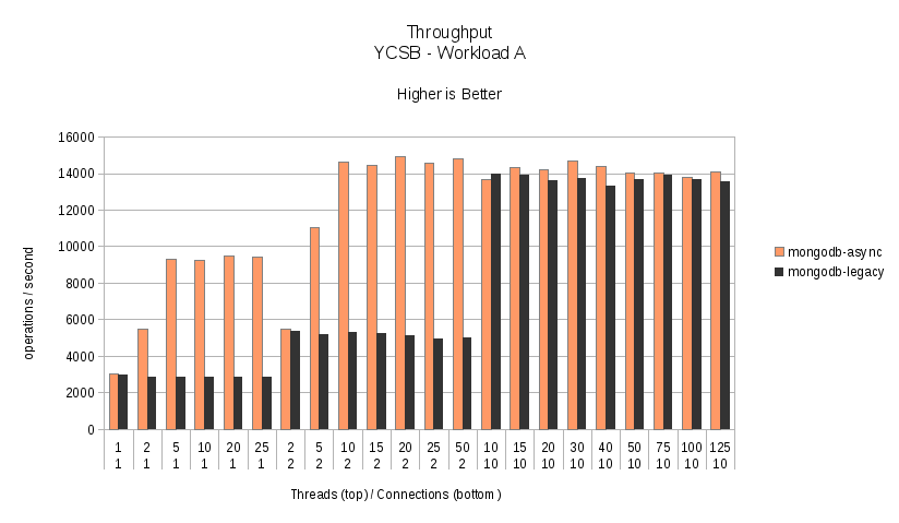 Based on previous testing with the YCSB and other users experience with the MongoDB driver for YCSB we have created and enhanced version of the both the legacy and the asynchronous driver. The enhancements are beyond the scope of this document but contain what we feel is the optimal, realistic, configuration for both drivers. We have also simplified the YCSB configuration to be based on the MongoDB URI only. All of the changes are available from the GitHub Repository. We have also created a YCSB Pull Request containing all of the updates so they will be included in the upstream releases.
